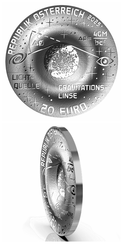 这枚银币设计巧妙,尽显钱币设计师对科学与艺术融合的深刻理解。其正面图案以凹陷背景点缀繁星点点,将观者的思绪引向浩瀚无垠的宇宙。画面左侧呈现的抽象漩涡,其下方刊德语“LICHTQUELLE(光源)”字样,代表遥远星系发出的光芒;右侧,一只象征观测者的眼睛与之相对,视线方向与光线路径形成夹角,并在夹角处标注符号“Δ∅”,代表光线的偏折角度,同时在眼睛上方刊关键公式“Δ∅=4GM/bc²”。其中G代表引力常数,M代表产生引力场的中心大质量物体质量,b代表光线未受偏折时的原始直线路径与大质量物体中心之间的最近距离(即碰撞参数),c代表光速。在光源与观测者之间,以向上弯曲的环形波为例,其下方边缘刊德语“GRAVITATIONSLINSE(引力透镜)”字样,象征爱因斯坦环形成的核心机制。
