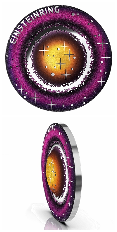 背面采用彩色印刷工艺,带来截然不同的视觉体验。紫色与金色相互交融辉映,模拟出遥远星系在引力透镜效应作用下的瑰丽效果与奇幻光轨。这层精心设计的色彩叠加,既是对宇宙神秘与壮丽的礼赞,也是对银币正面科学图景的艺术升华与诗意诠释。图案上缘刊德语“EINSTEINRING(爱因斯坦环)”字样,点明主题,让科学与艺术完美共鸣。