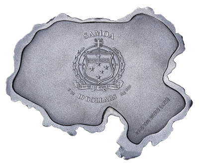 这枚仿古银币将萨摩亚国徽置于底座中央,并刊“萨摩亚”字样、重量、面额、成色、材质及华纳兄弟娱乐公司版权标识。边缘的一圈凸起有助于减少图案磨损。