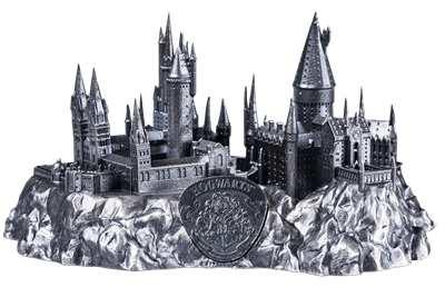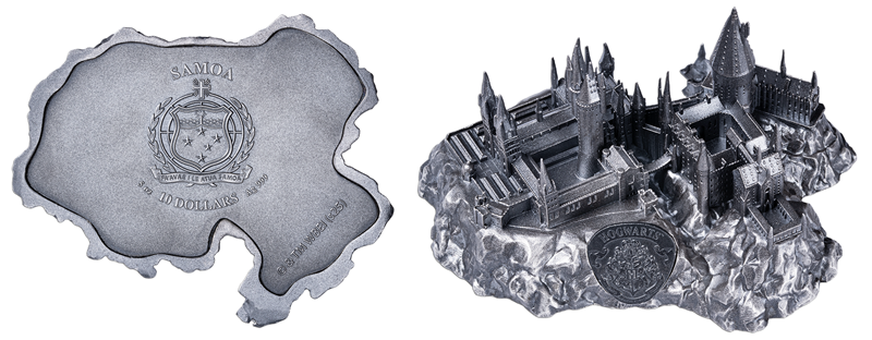 德国钱币商MDM经华纳兄弟娱乐公司授权开发设计,并获萨摩亚官方授权发行的霍格沃茨城堡3D仿古银币,便是一枚堪称“掌中雕塑”的精美贵金属币。该枚银币重量为5盎司,成色为99.9%,尺寸为66.3×80×41毫米,面额为10萨摩亚塔拉,发行量为499枚。