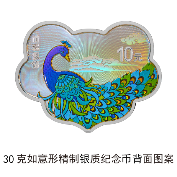30克如意形银质“前程似锦”纪念币背面图案为孔雀、祥云装饰组合图案,并刊“前程似锦”字样及面额。