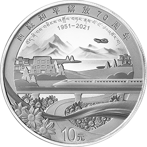 30克圆形银质纪念币背面图案为公路、铁路、动车、飞机、民居、雪山、湖泊、格桑花、飘带等组合设计,并刊“西藏和平解放70周年”汉、藏文,“1951-2021”字样及面额。