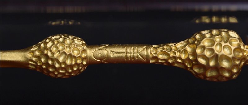 该枚镀金银币整体采用了极具真实感的3D立体设计,将老魔杖的古老纹理与层次直接呈现:杖身的结节与雕刻细节,甚至那些承载着魔法符文的纹路,都被精准刻画;24K金镀层在光线的照射下散发出耀眼光泽,恰如老魔杖与生俱来的至尊气场,间接体现了其深藏的非凡魔力。