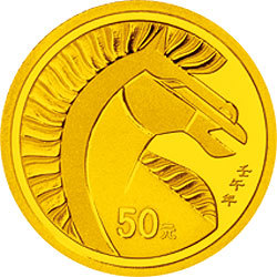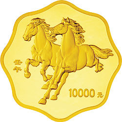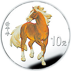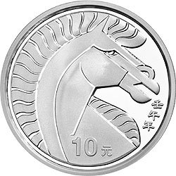 1/10盎司普制金币、1盎司普制银币共用同一图案,为骏马头部装饰造型,并刊面额;1/10盎 司彩色精制金币、1盎司彩色精制银币共用同一图案,为彩色骏马图,并刊面额;1公斤精制银币为两匹奔马图,并刊面额。