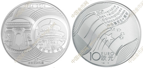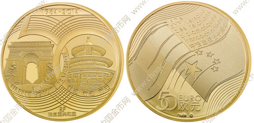 2014年是法中建交50周年,为铭记这一突破性的历史事件,法国中央银行定于2014年2月28日发行法中建交50周年金银纪念币一套,包括金币和银币各一枚。该套金银纪念币为法国法定货币,采用相同的设计图案,由巴黎造币厂铸造。除金银纪念币外,巴黎造币厂还打造了重360克的纪念铜章一枚,以凸显纪念意义。