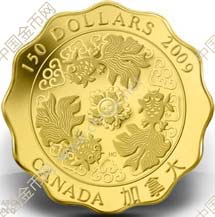加拿大于7月22日发行以中国文化为主题的金玉满堂(blessing of wealth)梅花形纪念金币一枚,该币是加拿大发行的首枚以中国文化为主题图案的99999纯金纪念币,由加拿大皇家造币厂铸造。 该币正面由苏珊娜设计,背面则由华人设计师由陈志昌(harvey chan)设计。陈志昌出生于香港,现居住多伦多,其作品曾多次被加拿大皇家铸币厂及加拿大邮务公司选用。正面图案: 中央为伊丽莎白女王肖像,币缘刊成色99999。背面图案: 币的中央为一朵牡丹花,寓意花开富贵,围绕其周围的是三条游动的金鱼,寓意“有余”;背景为一朵朵行云,与“行运”谐音,寓意行好运。币的上缘刊面额及发行年号,下缘英文和汉字“加拿大”字样。