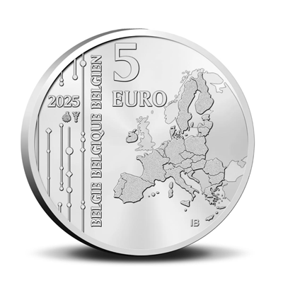 翻转至背面,视野豁然开朗。铜镍合金币右半侧,一幅欧洲大陆的版图以精妙笔触勾勒而成,面额“5 EURO”醒目地置于其左上方。左侧区域则以几列垂直线条与几何杆状图案作为装饰,简约而富有力量感。同时,发行年份“2025”与比利时三种官方语言书写的国名以纵向排列的方式并排镌刻,彰显其文化多元性。