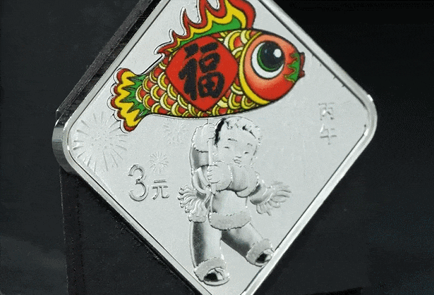 工艺方面主要分为两部分,即主图案“福”字和鱼灯采用彩喷工艺,孩童和烟花等背景元素采用多层次喷砂。具体来看,鱼灯主体使用局部彩喷工艺,以红色、黄色、橙色、绿色等鲜艳色彩精准还原传统喜庆色彩,突出喜庆意象。鱼灯上的“福”字则以黑色浮雕字体呈现,强化祈福寓意。彩喷部分与币面其他区域的哑光质感形成鲜明对比,使鱼灯成为画面中的视觉焦点。