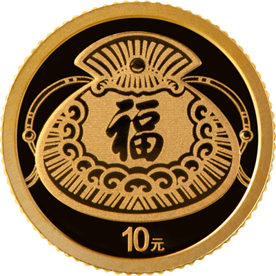 金币背面图案为“福”字、荷包组合设计,并刊面额。其设计灵感源于中国传统刺绣荷包,币面中心突出表现乾隆御笔福字,整体构图融汇藏福与纳财之美意,彰显吉祥富足的传统文化内涵。