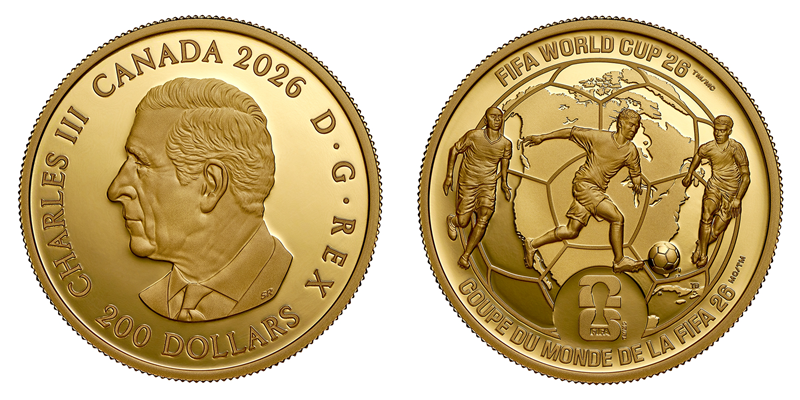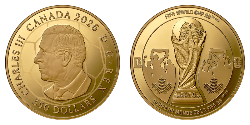 “欢庆时刻”5盎司金币成色为99.99%,重量为156.05克,直径为60毫米,面额为350加拿大元,发行量为175枚。正面图案由艺术家史蒂文·罗萨蒂(Steven Rosati)设计,画面中央为英国现任国王查尔斯三世肖像,并衬足球纹理背景,肖像上的字母“SR”为史蒂文·罗萨蒂的姓名首字母缩写。币缘处刊印“国王查尔斯三世·蒙上帝恩典”字样、国名、年号及面额。背面图案由艺术家格伦·格林(Glen Green)设计,画面中央为国际足联世界杯官方奖杯,两侧环绕着欢呼球迷的剪影,凸显了获胜队伍在座无虚席的体育场和全球观众面前举起世界杯奖杯的盛大景象。球迷剪影叠加马赛克风格的枫叶标志,突显了加拿大作为2026年世界杯联办国的独特地位。币缘两侧为2026年世界杯的官方标志,币缘顶部与底部也分别标注英法双语的赛事官方名称。