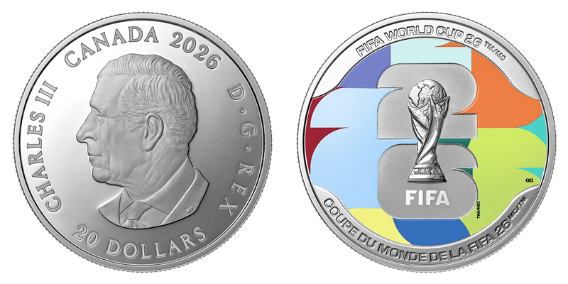 “相约26”1盎司彩色银币成色为99.99%,重量为31.39克,直径为38毫米,面额为20加拿大元,发行量为11000枚。正面主图和1盎司及1/4盎司金币保持一致。背面图案由艺术家格伦·格林设计,采用局部上色工艺,醒目呈现2026年世界杯官方会徽与主题色彩,生动展现出三个联办国的活力与多元文化魅力。